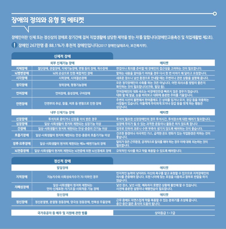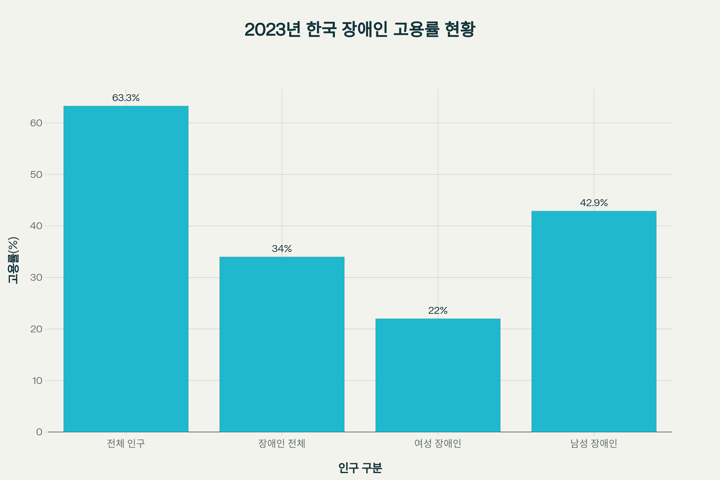 2023년 기준 한국의 장애인 고용률은 34.0%로 전체 인구 고용률 63.3%의 절반 수준에 머물고 있습니다. 특히 여성 장애인의 고용률은 22.0%로 더욱 낮은 상황입니다.