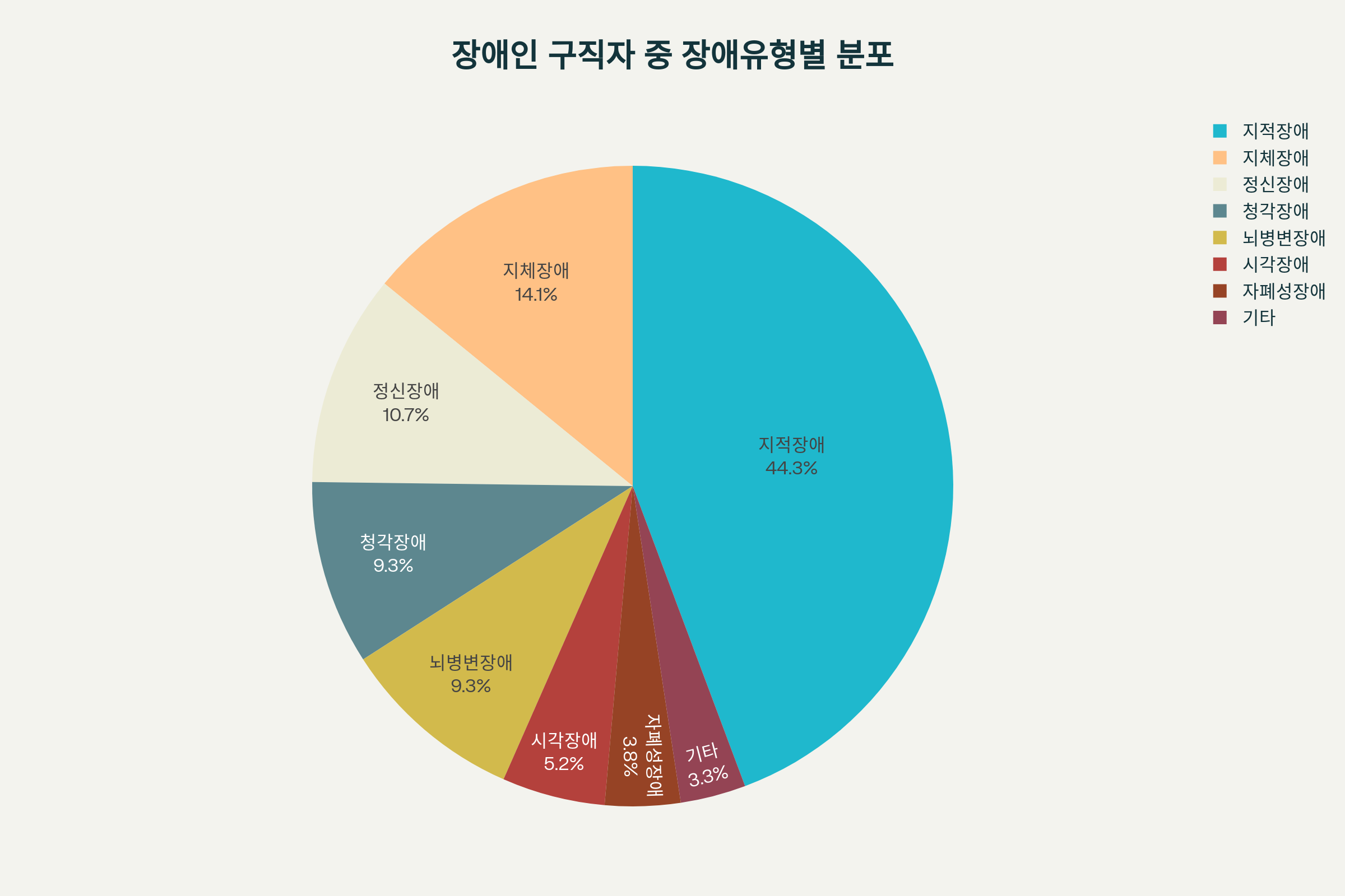 장애인 구직자 중 지적장애인이 44.3%로 가장 높은 비율을 차지하고 있어, 이들이 취업 과정에서 겪는 어려움과 취약성을 보여줍니다.