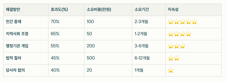 데이터 분석 결과,민간 중재 방식이 가장 높은 효과도(70%)를 보이면서도 상대적으로 저렴한 비용(100만원)으로 해결 가능한 것으로 나타났다. 이는인간적인 접근과전문성이 결합될 때 최적의 결과를 얻을 수 있음을 시사한다.