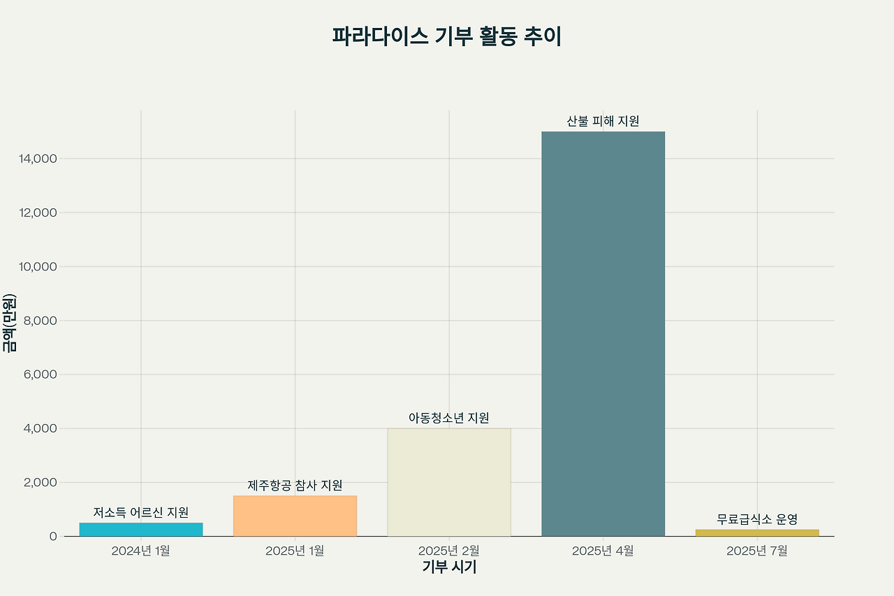 - 2025년 4월: 산불 피해 지원을 위해 1억 5천만원 기부