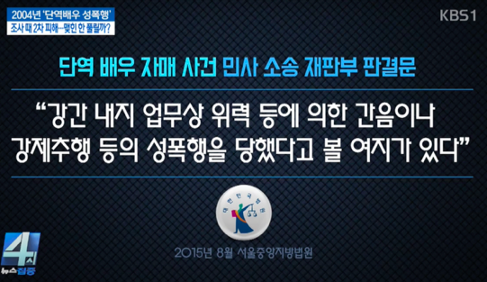 소라 씨의 고백에 따르면, 그는 3개월 동안 보조출연 관리업체의 반장과 캐스팅 담당자 등총 12명에게 성폭행 4건, 성추행 8건을 당했다.가해자들은 "술 깨고 가자"며 소라 씨를 모텔이나 비디오방으로 데려가 성폭행했으며, "라이터로 지져버리겠다", "칼로 도려내겠다"고 협박하며 저항을 막았다.