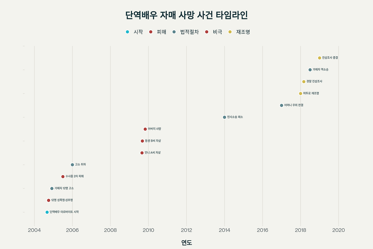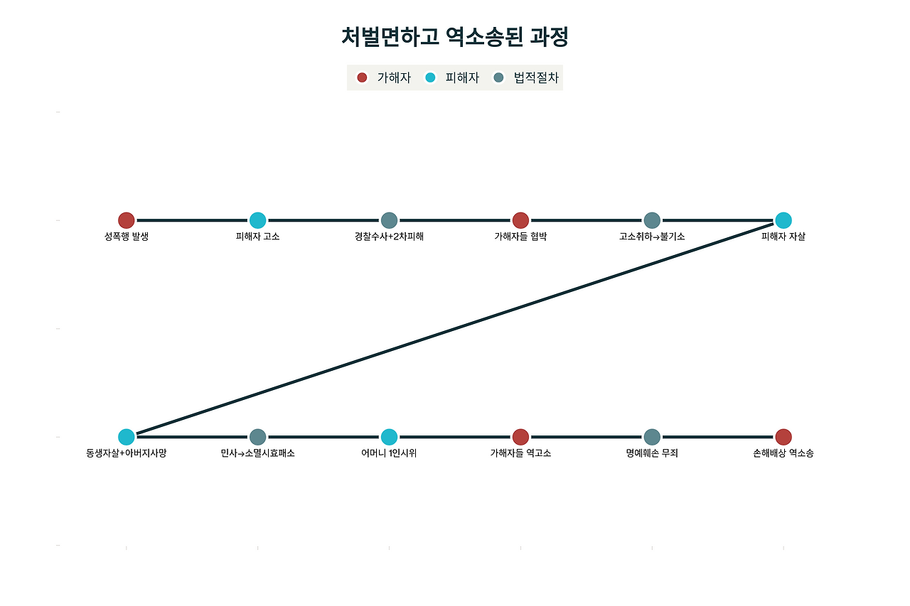 단역배우 자매 사망 사건은 한국 사회의성범죄 대응 시스템의 총체적 실패를 보여주는 대표적 사례다. 12명의 가해자들이 집단으로 한 여성을 성폭행했음에도 불구하고 아무도 처벌받지 않았고, 오히려 피해자 가족이 가해자들에게 돈을 지급해야 하는 현실은정의가 완전히 뒤바뀐 상황이다.