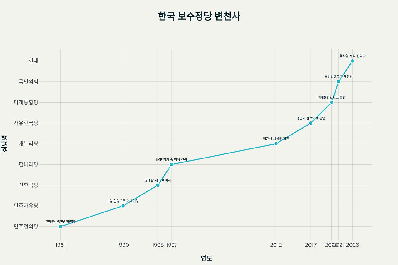 본 분석에서는 민주정의당 시절부터 현재까지 이어져 온 보수정당의 역사적 변천사를 토대로, 국민의힘이 직면한 현재의 위기와 미래 전망을 심층 분석하고, 진정한 보수 재건의 방향을 제시하고자 한다.