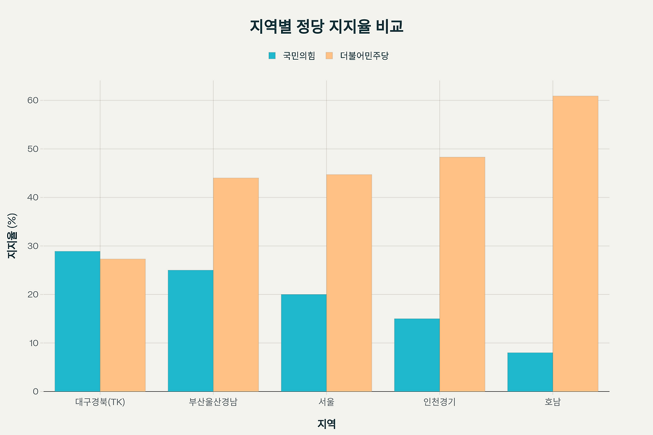 이러한 지역적 편중은 국민의힘을 '영남당'으로 만들고 있으며, 전국 정당으로서의 경쟁력을 크게 약화시키고 있다. 108석 중 영남 지역이 59석을 차지하는 현실은 이를 극명하게 보여준다.
