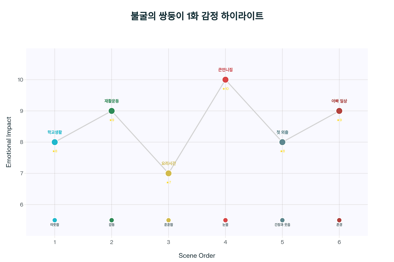 아빠가 일하다가 손가락을 다쳐오신 날, 지수가 울면서 걱정하고 지민이가 "이젠 우리가 도와드릴게요"라고 말하는 장면에서 완전히 무너졌어요. 아빠 머리까지 감겨주겠다고 하는 쌍둥이들 보고 얼마나 울었는지...