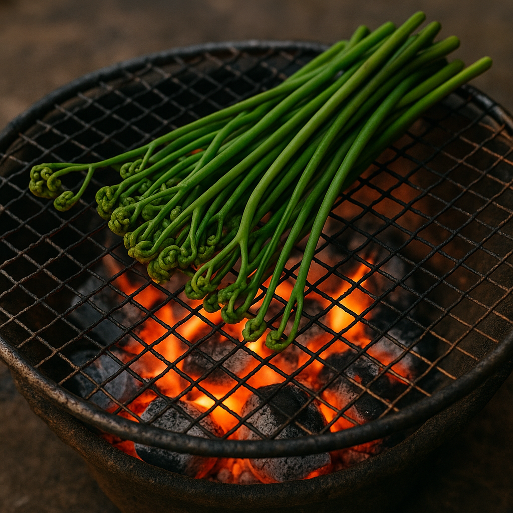 - 스테인리스 핀셋으로 고사리·백김치를 구워 고기의 감칠맛을 증폭한다.