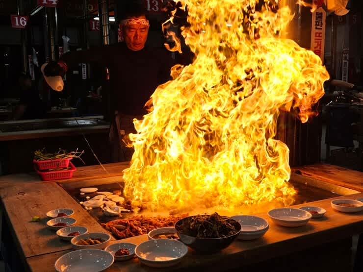 - “팡!” 불쇼 순간 900℃ 화염이 지방을 캐러멜화.