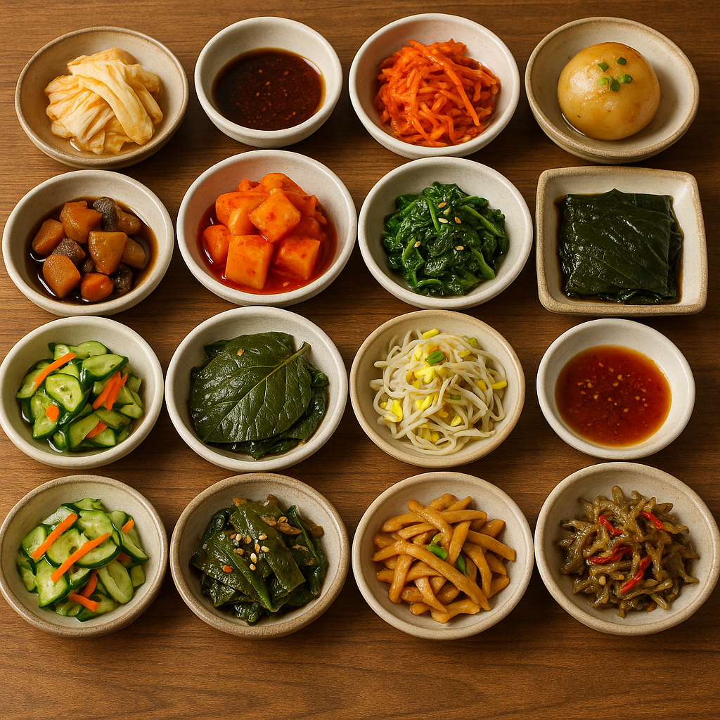 밑반찬 14종, 소스 8종. 마늘소스·갈치속젓·명이나물 등 염·산·향 조합으로 미각 피로 감소.