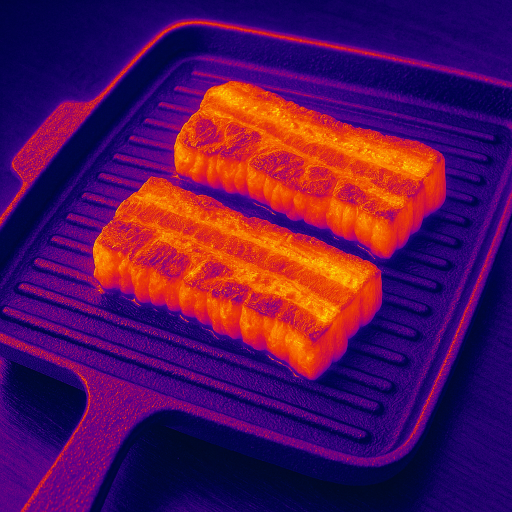 열화상 실험 결과 175℃±2℃가 최적. 과열 시 육즙 손실 12%↑, 저온 시 표면 수분 잔존.
