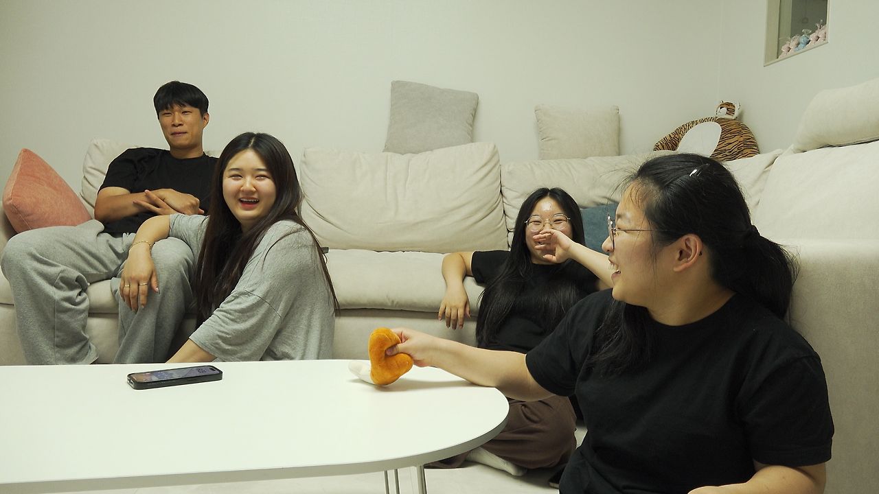 "이거 애정 표현 아니라고. 어허. 한 개만 짜아" 라며 장난치는 모습과 "윙크하지 말랬지" 하는 수빈 언니의 대화가 정말 자연스럽고 귀여웠어요. 쌍둥이와 열 살 차이 나는 큰언니는 여전히 동생들의 "군기 반장" 역할을 하고 있었습니다 🎖️.