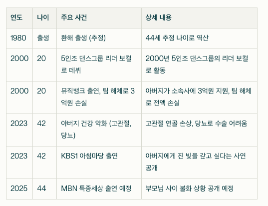 트로트 가수 환해(44세 추정)가 2025년 7월 24일 MBN 특종세상 697회에 출연하여 10년 동안 생일날 함께하지 못한 가족의 아픈 사연을 공개했습니다. 과거 5인조 댄스그룹 출신에서 현재 트로트 가수로 활동 중인 환해의 인생 역정과 가족 관계의 복잡한 내막을 완전 분석해보겠습니다.