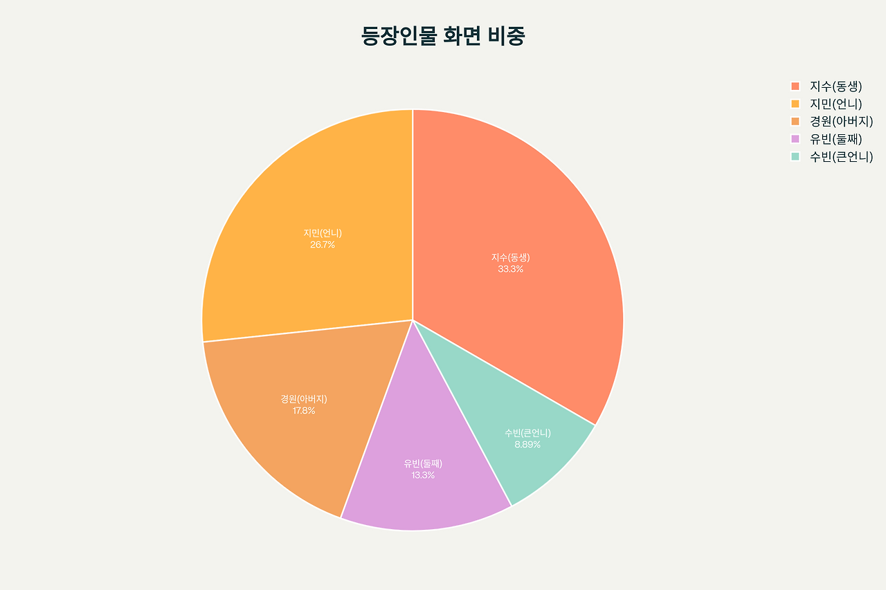 5부에서는 특히 주인공 지수에게 가장 많은 화면 분량이 할애되었습니다. 박지수가 15분으로 가장 많았고, 1분 언니 박지민이 12분, 든든한 아빠 박경원씨가 8분의 비중을 차지했어요. 이는 마지막 회차답게 지수의 성장과 도전에 집중한 구성이었다고 볼 수 있습니다!