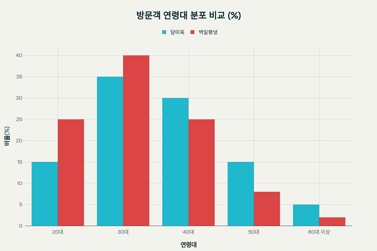 방문객 연령대 분포를 살펴보면, 백일평냉은 20~30대 젊은 층의 비율(65%)이 높은 반면, 담미옥은 30~40대 중년층의 비율(65%)이 높아 각각 다른 고객층을 대상으로 하고 있음을 알 수 있다.