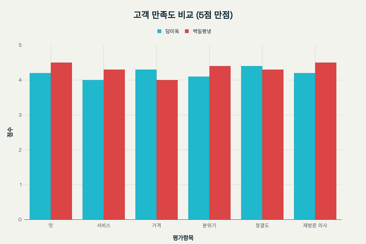 고객 만족도 조사 결과를 보면, 백일평냉이 맛(4.5점)과 재방문 의사(4.5점)에서 높은 점수를 받았으며, 담미옥은 가격(4.3점)과 청결도(4.4점)에서 우수한 평가를 받았다. 특히 백일평냉의 리뷰 수(298건)가 담미옥(156건)보다 거의 두 배에 달하는 것은 상대적으로 높은 인지도를 보여준다.