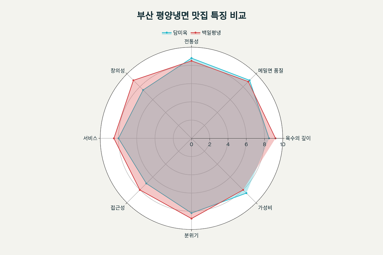 위의 레이더 차트에서 볼 수 있듯이, 두 식당은 각각 다른 강점을 가지고 있다. 담미옥은 메밀면 품질(9.0점)과 전통성(8.8점), 가성비(8.5점)에서 높은 점수를 받았으며, 백일평냉은 육수의 깊이(9.2점)와 창의성(9.0점), 분위기(8.8점)에서 우수한 평가를 받았다.