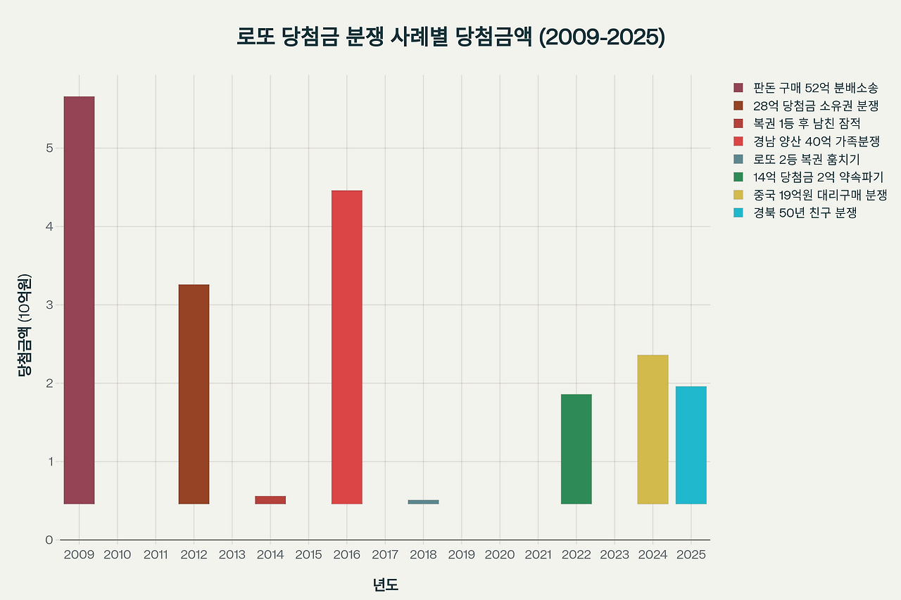 위 차트에서 볼 수 있듯이, 로또 당첨금을 둘러싼 분쟁은 결코 드문 일이 아니다. 2009년부터 2025년까지 집계된 주요 사례들만 봐도 그 심각성을 알 수 있다.
