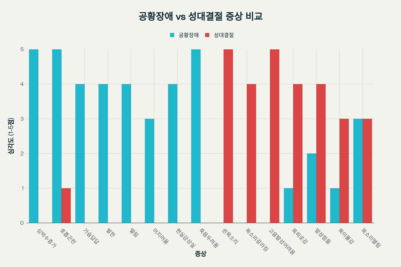 😱 공황장애는 신체·정신 증상이 다발성으로 폭발하고, 😵💫 성대결절은 음성 기능을 정조준한다. 전영랑 사례처럼 두 질환이 동시 발생하면 발성과 호흡 모두 무너져 ‘노래 불가’ 상태에 빠진다.