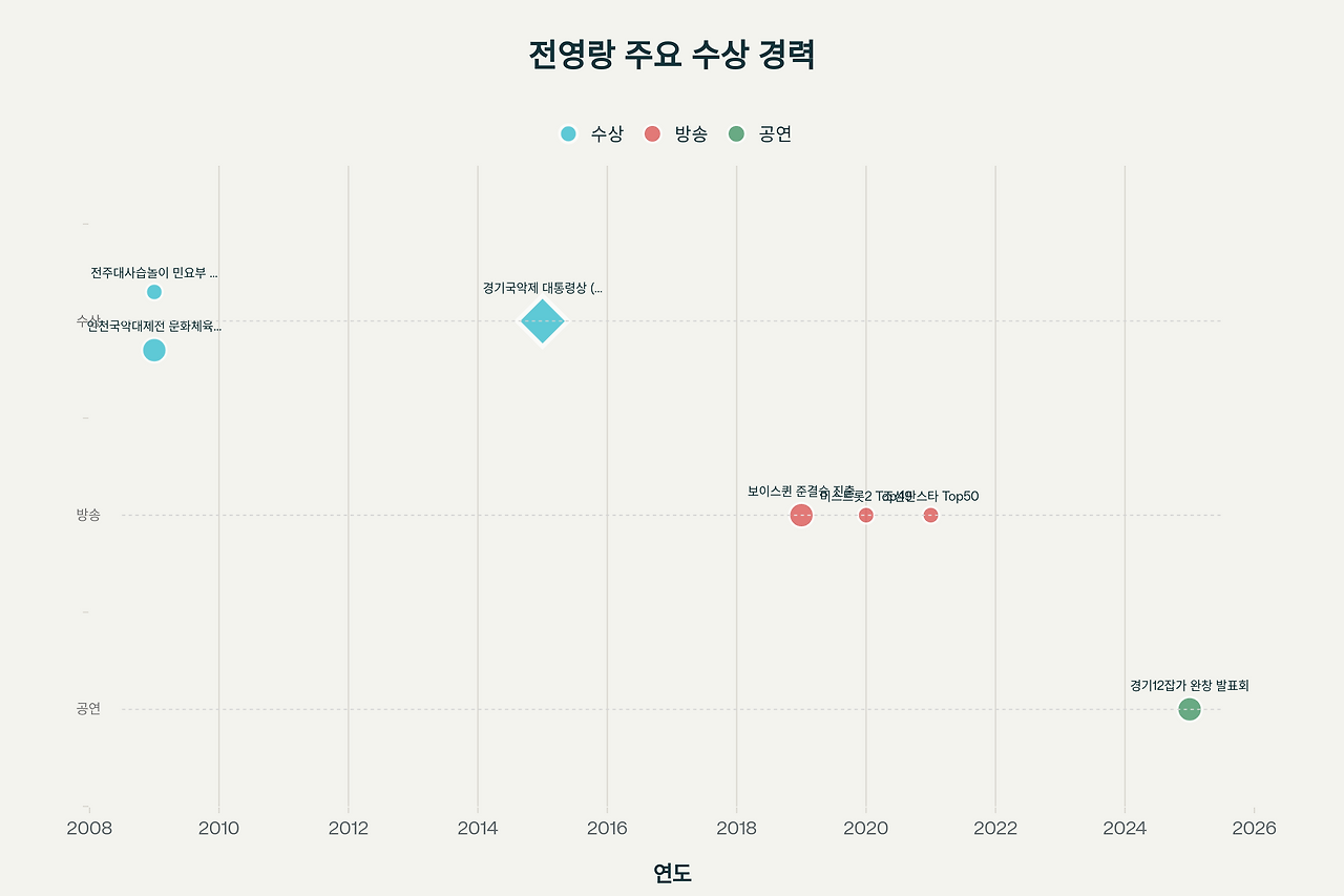 그의 커리어는 ‘경기민요 대통령상 최연소 수상’(2015)을 정점으로 상승했다가, 2019년 <보이스퀸> 준결승 이후 급격히 꺾였다. 아래 차트는 2009~2025년 주요 경력을 한눈에 보여 준다.