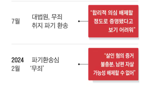 앞선 두 사건은 명확한 직접 증거와 계획적 범행의 흔적이 있어 무기징역이 확정되었지만, 이번 사건은 간접증거만 존재하고 합리적 의심이 해소되지 않아 무죄가 확정되었다는 점에서 차이를 보인다.