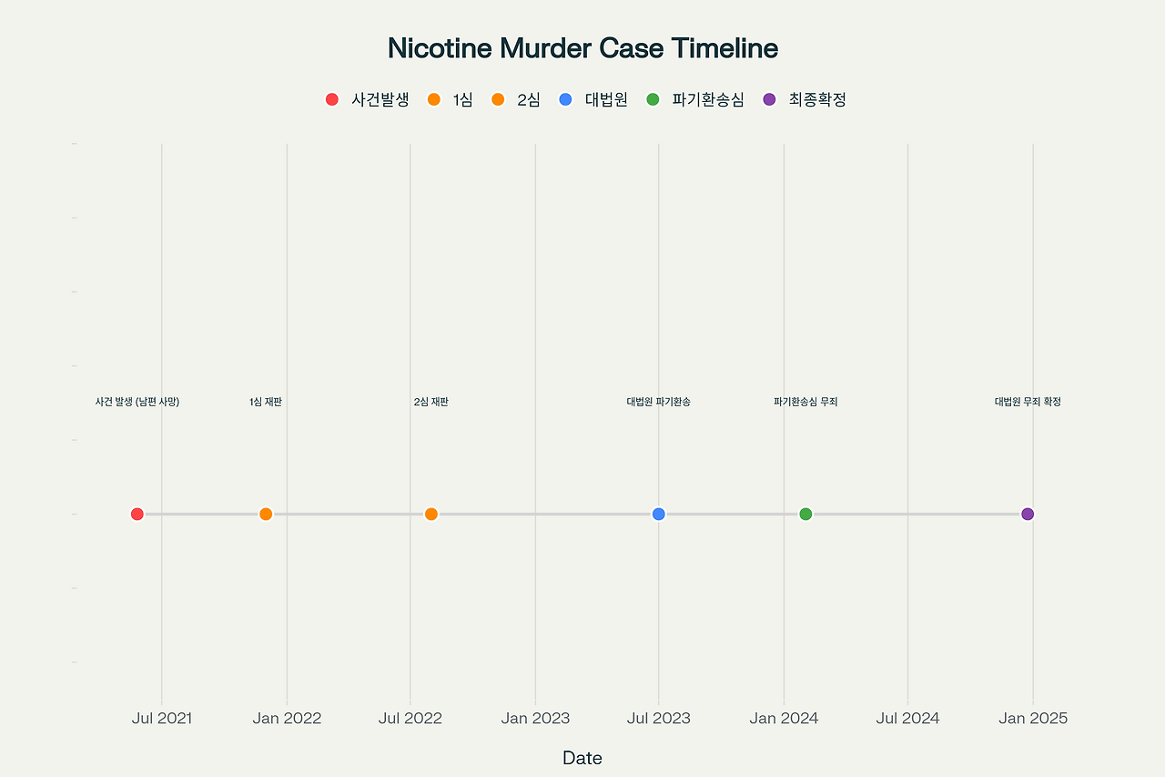국내 최초 니코틴 독살사건으로 주목받았던 이 사건은 2021년 남편 사망으로 시작되어 2024년 대법원 무죄 확정까지 3년여간 법정을 오간 충격적인 사건이다. 1심과 2심에서 징역 30년의 중형을 받았던 30대 여성 A씨가 결국 대법원에서 무죄를 확정받기까지의 과정은 한국 사법부의 신중한 법적 판단과 합리적 의심의 원칙을 보여주는 대표적 사례가 되었다.