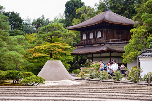 긴카쿠지는 1490년 쇼군 아시카가 요시미쓰의 손자인 아시카가 야스히로에 의해 세워진 은빛 별장으로, 공식 명칭은 ‘지쇼지’이다. 실제로 은박이 칠해지지는 않았으나, ‘은의 별장’이란 뜻은 조용하고 소박한 미학을 강조한다. 정원은 모래 언덕과 깎아지른 듯한 모래 산이 조화를 이루며, 가레산스이(枯山水) 양식의 전형으로 학술적 관심을 끈다.