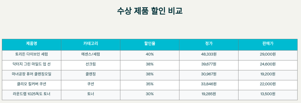 이 세일은 단순한 할인 행사가 아닙니다! 올리브영이 1년간의 소비 데이터 1.8억 건을 분석하여 선정한 2025 올리브영 어워즈 수상 제품들이 중심이 되는 특별한 행사입니다. 매년 12월 초에만 만날 수 있는 이 독특한 세일의 가장 큰 특징은 검증된 제품들의 대대적인 할인과 한정판 기획세트의 독점 출시라는 점입니다! 💝