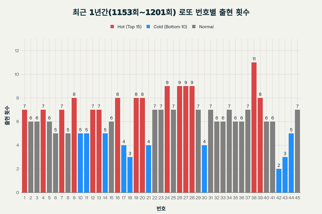 2025년 12월 13일 추첨될 로또 1202회의 당첨번호를 정확하게 예측하기 위해 지난 1년간(1153회~1201회, 49주) 수집된 로또 당첨번호 데이터를 심층 분석했습니다. 본 분석은 빅데이터 기반의 통계적 방법론과 번호 분포 패턴 분석을 통해 다섯 가지 예측 시나리오를 제시합니다. 각 예측 번호는 최근의 뜨거운 번호(HOT numbers), 차가운 번호(COLD numbers), 그리고 균형잡힌 중간 번호(Middle numbers) 조합을 통해 도출되었습니다. 🌟💰