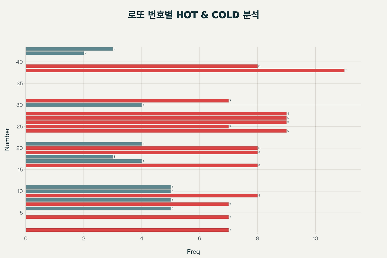 본 예측은 최근 1년간 가장 활성화된 상위 번호들만을 정선(精選)하여 구성했습니다. 38번(11회), 24번(9회), 27번(9회), 26번(9회)은 모두 TOP 4 번호들이며, 39번(8회)과 43번(3회)을 추가했습니다. 이 조합은 지난 1년간의 추세를 가장 직관적으로 반영하는 공격형 예측으로, 최근 월별 누적 통계에서 강력한 상승세를 보이는 번호들의 연장선상에 있습니다. 특히 20대~40대 초반의 번호들이 지배적인 현황을 감안하면, 이 대역의 번호들을 중심으로 한 선택이 합리적입니다. HOT 번호 5개와 COLD 번호 1개로 구성되어 있으며, 이는 역사적으로 증명된 로또의 '장기적 편중성'을 최대한 활용한 전략입니다. 최근의 매크로 트렌드가 계속될 경우, 이 세트에서의 당첨 확률이 매우 높을 것으로 예상됩니다. 📈