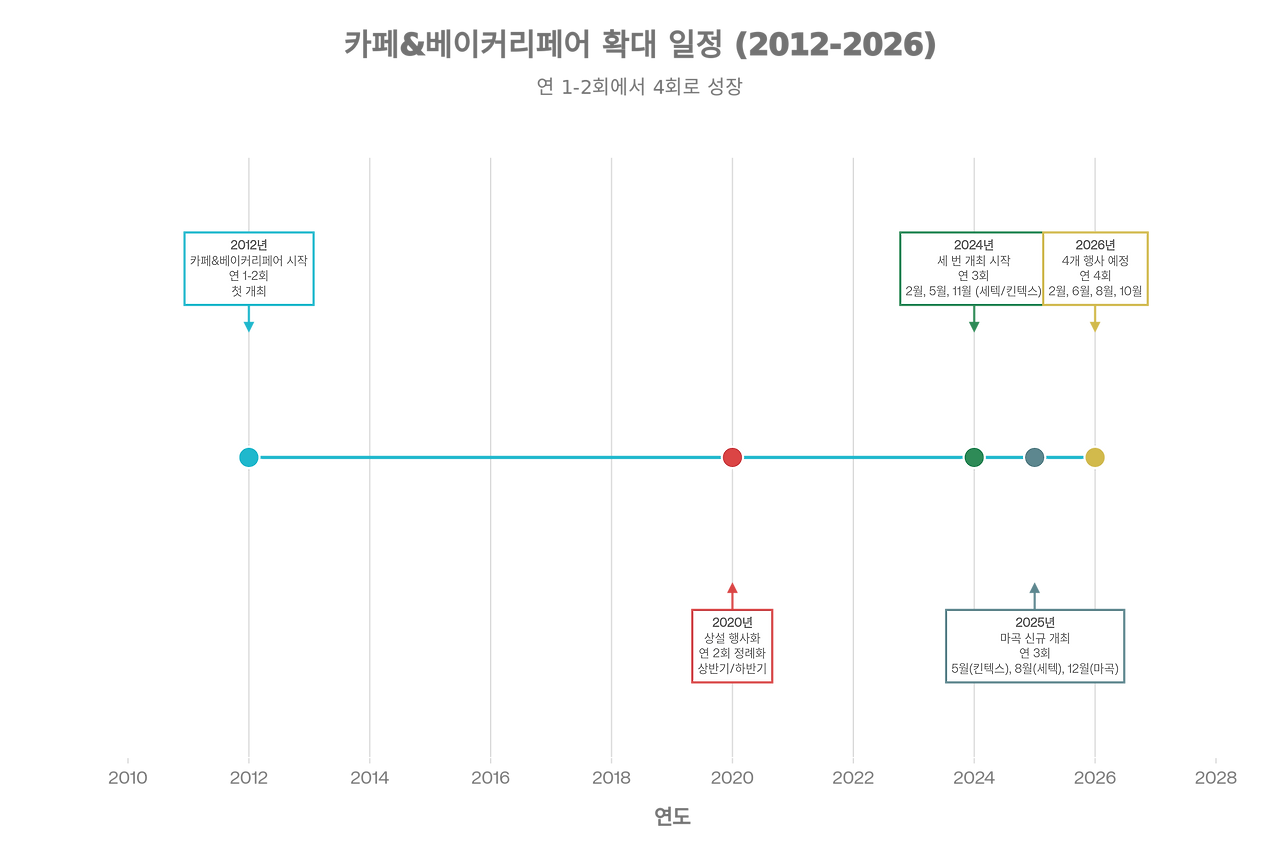 카페&베이커리페어는 2012년에 처음 시작된 이래 국내 최대 규모의 커피 비즈니스 플랫폼으로 성장했습니다. 초기에는 연 1-2회 정도 개최되던 행사가 2024년부터는 연 3회 정례 행사로 정착되었으며, 2025년부터는 마곡에 신규 행사를 추가하여 연간 3-4회 개최되는 대규모 행사로 발전했습니다.
