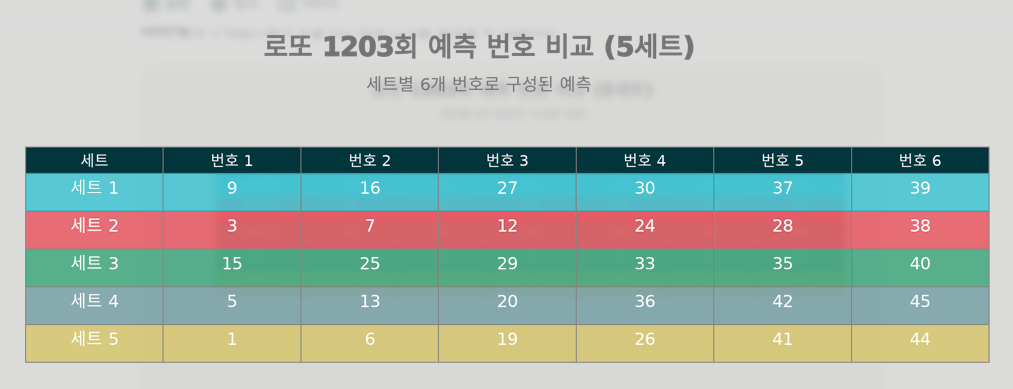 로또 1203회는 2025년 12월 20일 토요일에 추첨되는 특별한 회차입니다. 본 분석은 2024년 12월 14일(1150회)부터 2025년 12월 13일(1202회)까지 정확히 1년간(52주)의 당첨번호 데이터를 바탕으로 통계적 패턴을 분석하여 5세트의 예측 번호를 제시합니다. 빅데이터 기반의 출현 빈도 분석, 최근 트렌드 추적, 회복 대기 번호 선별 등 다층적인 분석 기법을 활용하여 당첨 확률을 높이는 전략적 조합을 구성했습니다. 🎯