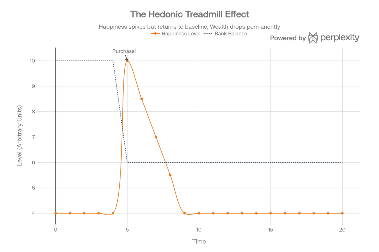 우리는 무언가를 사면 행복해질 것이라 착각합니다. 새 차, 새 집, 명품 시계... 하지만 심리학 연구에 따르면, 구매로 인한 행복감은 아주 잠시 솟구쳤다가 금세 **기본 수준(Baseline)**으로 돌아옵니다. 이를 **'쾌락의 쳇바퀴'**라고 합니다. 문제는 행복은 제자리로 돌아오지만, 통장 잔고는 영원히 줄어든다는 점입니다.