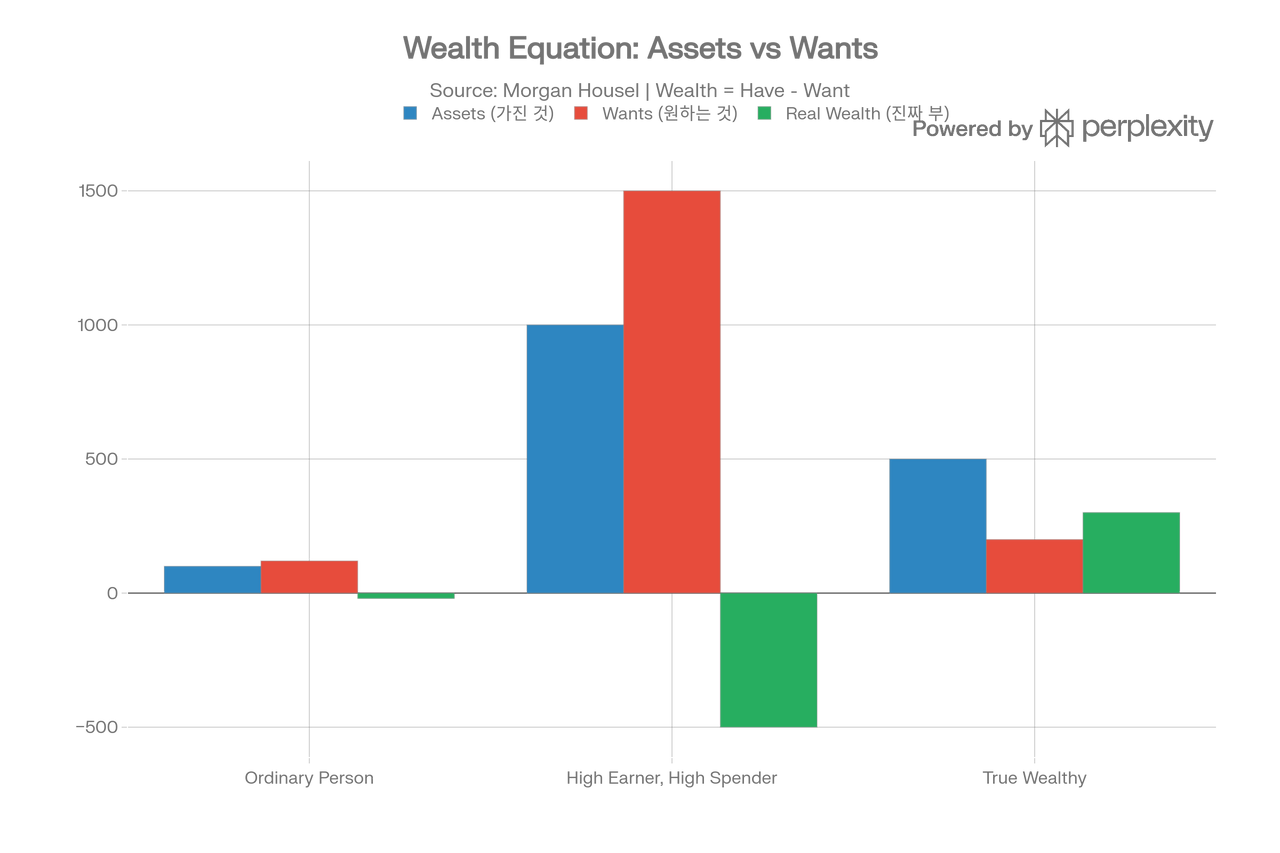 많은 사람들이 '부자'가 되기 위해 **Assets(가진 것)**을 늘리는 데에만 혈안이 되어 있습니다. 연봉을 높이고, 투자 수익률을 올리고, 더 많은 자산을 축적하려고 노력하죠. 하지만 모건 하우절은 이 방정식의 오른쪽 항, 즉 **Desires(원하는 것)**를 통제하지 못하면 결코 부자가 될 수 없다고 경고합니다.