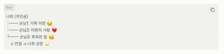 이 간단한 도표는 인물들의 얽힘을 보여주며, 나희가 중심이 되어 테마를 풀어냅니다.