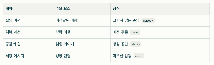 나희의 여정은 타인의 마지막 부탁을 통해 자기 치유로 이어집니다. 미처 하지 못한 말, 정리되지 않은 마음이 핵심 모티브예요. 📝 작가는 오해와 경계를 풀며 공감으로 나아가는 과정을 층층이 쌓아, 감정의 깊이를 더합니다. 독자들은 나희처럼 '살아갈 이유'를 발견하게 돼요. 😌